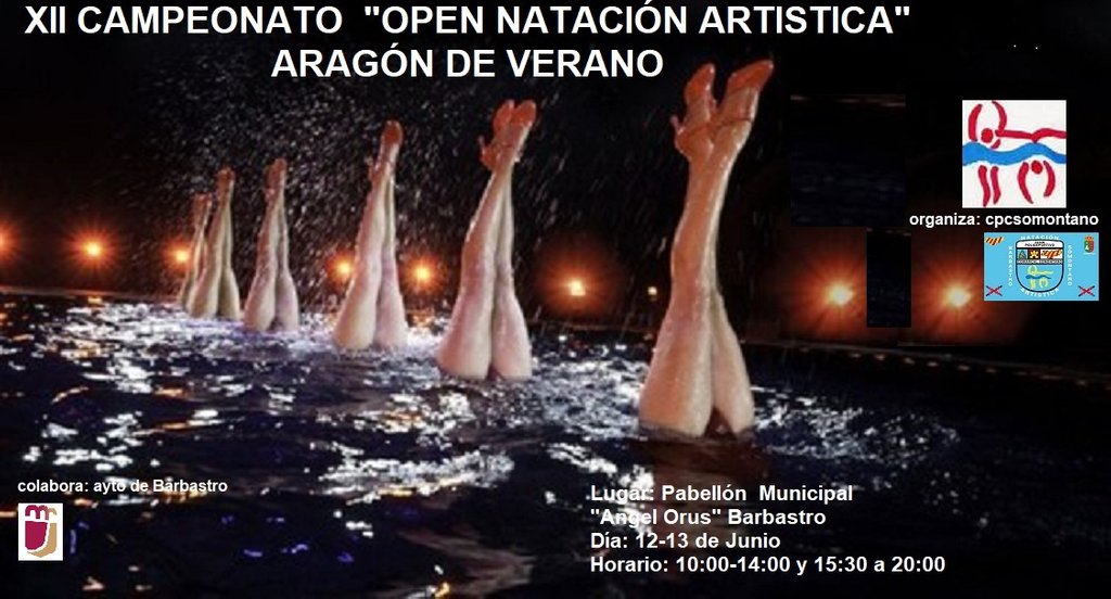 El día 12 y 13 de Junio realizaremos después de varios años sin tener en nuestra localidad campeonatos oficiales de la FAN. Acogemos con ganas el XII campeonato Open de Aragón de Natación Artística, dentro de una temporada bastante triste, por todo lo pasado en el mundo «COVIID 19», Eso si las ganas y la ilusión que tenemos no desaparece por este bello deporte. Gracias a todas las familias y personas que ayudan a que esto siga adelante. NOS VEMOS EN BARBASTRO PARA DISFRUTAR DE NUESTRO DEPORTE DIA: 12-13 de Junio PISCINA: Piscina Municipal «Angle Orus» LOCALIDAD: Barbastro (Huesca) HORARIO: de 10:00 a 14:00 y de 15:30 a 20:00