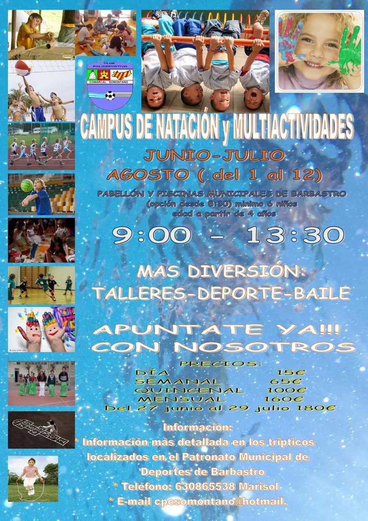¡Ya está aquí el Campus de Verano del CPC Somontano! Amigos, sol, piscina, juegos, diversión y los mejores recuerdos del verano en este campus con un EQUIPO TÉCNICO cualificado. Practica deportes como natación, fútbol, voley, balonmano, atletismo, hockey o bádminton. Disfruta de divertidos juegos para desarrollar cualidades físicas básicas, la confianza y la cooperación, e incluso acuáticos… y con paracaídas. Además de un montón de talleres y muchas más sorpresas. Disponibilidad de ampliación de horario (consultar condiciones) y descuento por 2 o más hijos. Información e inscripciones: Tríptico-frente.jpg | Tríptico-dorso.jpg cpcsomontano@hotmail.com   ¡Apúntate ya… para no quedarte sin plaza!